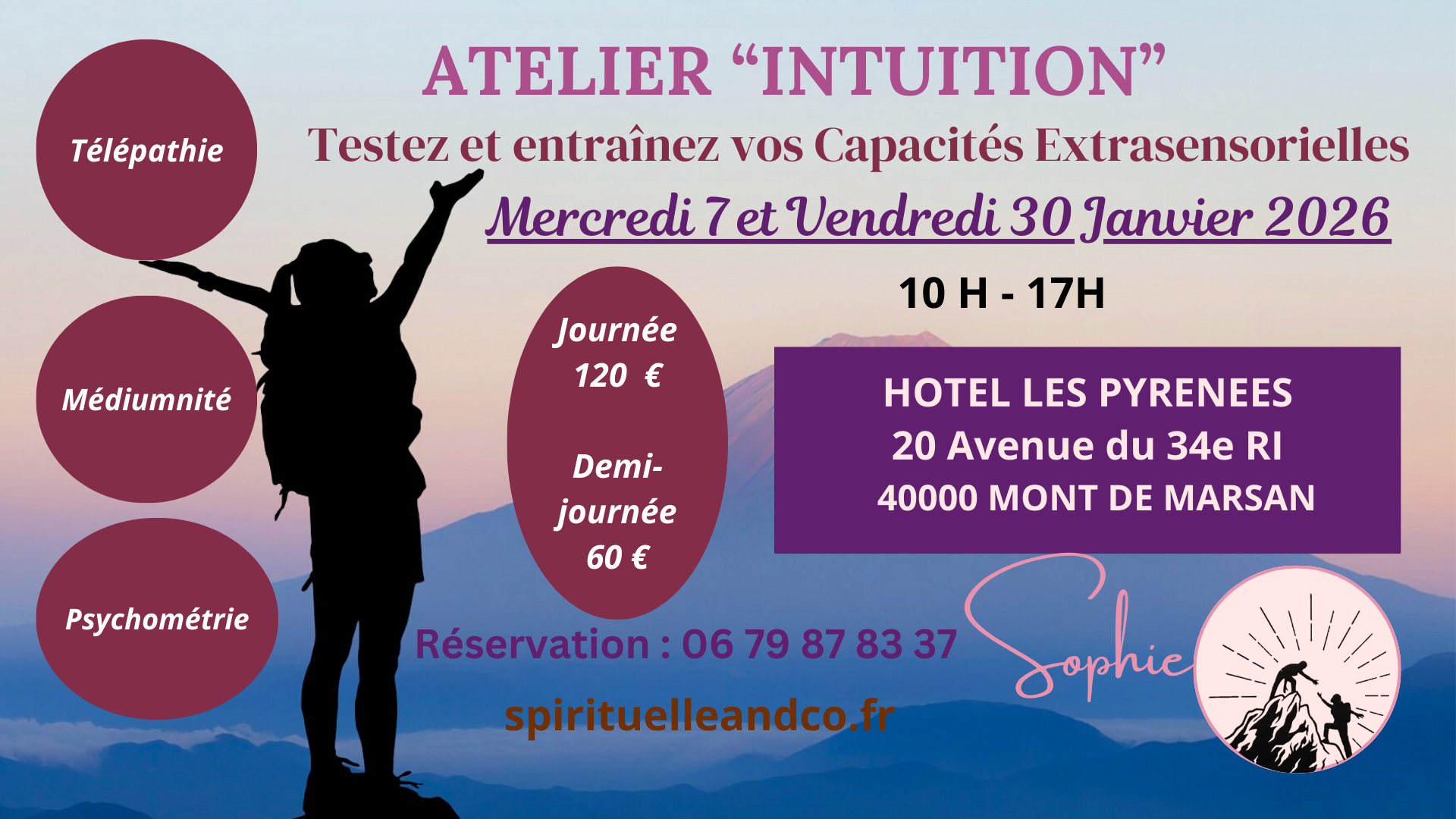 Je propose également un cours collectifsous forme d’atelier (groupe maximum de 12 personnes) pour tester et entraîner votre intuition et vos capacités extrasensorielles. La majorité des exercices se fait en binôme.